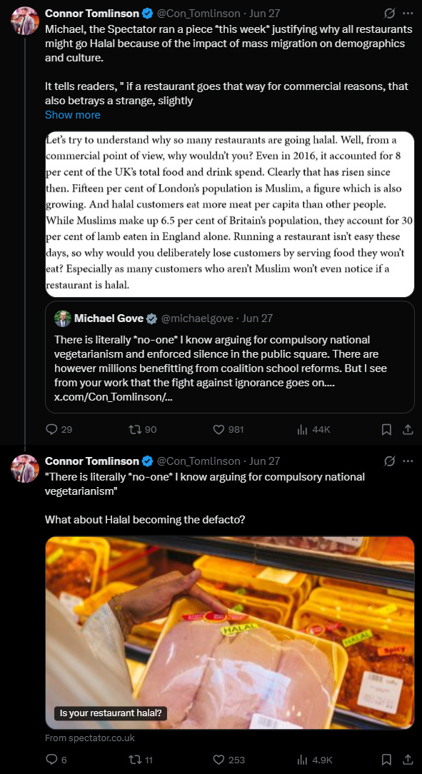 Despite insisting that “There is literally *no-one* I know arguing for compulsory national vegetarianism and enforced silence in the public square”, an article appeared in the Spectator that week justifying why British restaurants might go Halal to accommodate the impact of mass migration on demographics and culture.