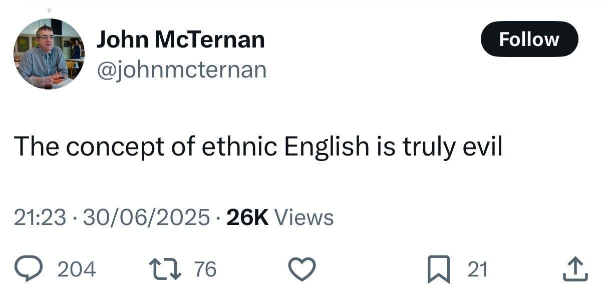 To suggest, as McTernan did, that it is “truly evil” to even conceive of the English as an ethnic group, is to deny our right to describe, recognise and understand ourselves. That is the true evil.