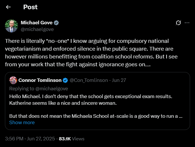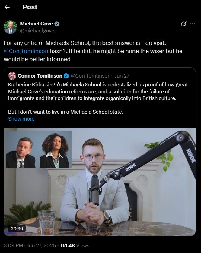 This, and the accompanying clip from Tomlinson Talks in which I discussed the article, provoked a response from Michael Gove — who has long celebrated Michaela as proof that his education reforms were a success.