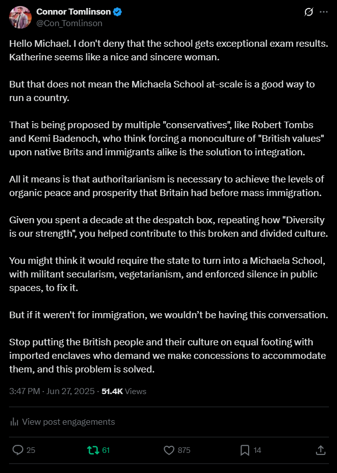 what Badenoch, Birbalsingh, and the Michaela School model represent is a replacement of Britain’s traditional high-trust, homogenous, self-governing spontaneous order with an authoritarian headmistress state to make new tribal minorities and the besieged host majority play nice.