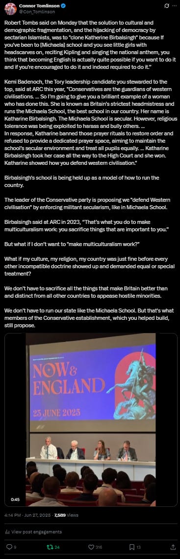But because British politics continues to orbit the gravity-well of the Second World War, even our nationalist elites feel a need to argue for ethno-cultural homogeneity by proxy, for Israel, and insisting on Churchillian interventionism abroad, while practicing liberal pluralism and a Chamberlain-esque multicultural appeasement strategy at home. Rather than arguing for Anglo-Zionism — for Britain to have what Israel has — they defend the Jewish people's right to survive “as a race” when faced with genocidal threats, while remaining indifferent to the equally tragic displacement of the British from their historic homeland. This is also why any non-moral distinction along ethnic lines, or qualitative judgement between cultures, is treated like the Volk racism of the Third Reich by the likes of McTernan. (While supporting the Jewish people in the protection of their only state.)